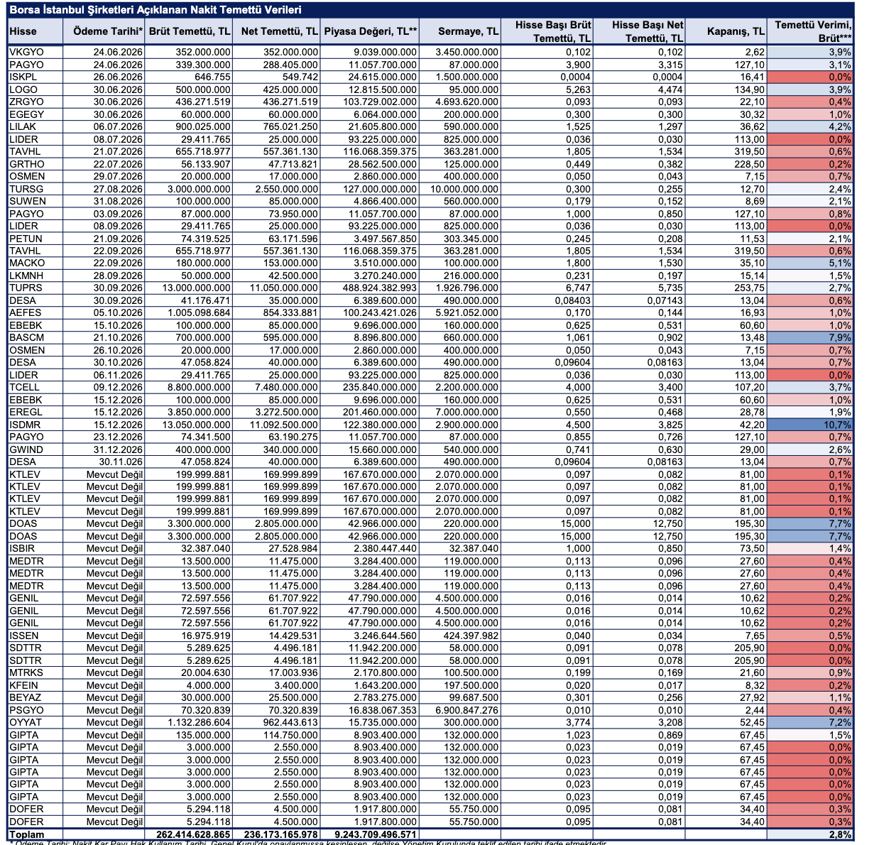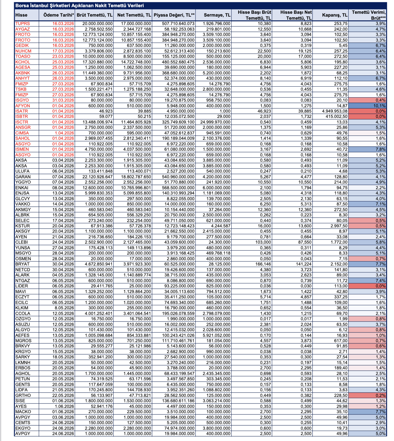 BMD Araştırma'nın analizine göre, 2025 yılı karından temettü dağıtımına dair yönetim kurulu kararı almış BİST şirketlerinin dağıtmayı planladığı nakit temettü tutarı, temettü dağıtım tarihi ve temettü verileri şu şekilde: